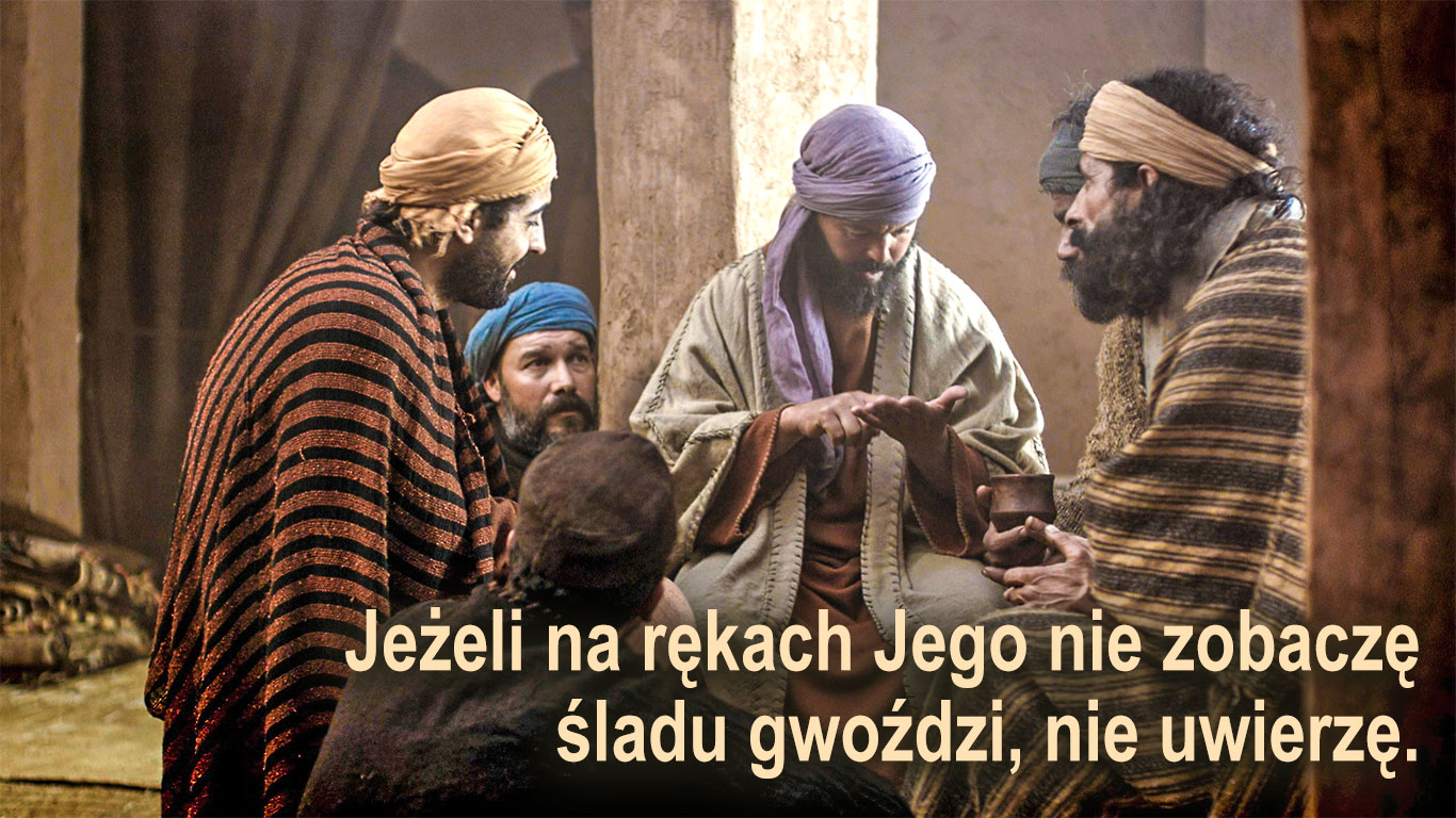 Ale on rzekł do nich: «Jeżeli na rękach Jego nie zobaczę śladu gwoździ i nie włożę palca mego w miejsce gwoździ, i ręki mojej nie włożę w bok Jego, nie uwierzę».